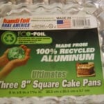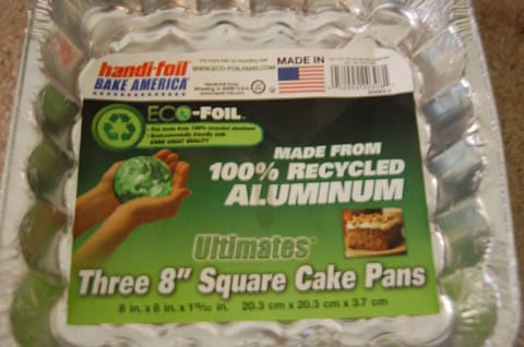 Right about now you’re probably wondering why I — a person who supposedly cares and blogs about eco-friendly living — would be cooking in a disposable pan. I confess, I doubled this recipe and made a cake for a friend and I didn’t want her to have to return a pan to me. At least I found disposable pans made from recycled aluminum — as evidenced by the hand model gently cradling a tiny, green-dyed earth — but I still have a case of Green Guilt.