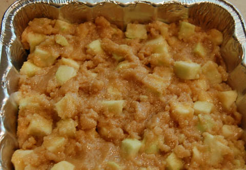 Stir in the apple mixture, and things will improve — just a little. Instead of immovable sludge, you’ll have a semi-spreadable Liquid Nails sort of batter. Go ahead and drag it around your prepared pan, trying to keep the apples evenly distributed throughout. Don’t worry if it’s not perfect: