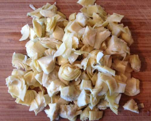 - Remove any tough leaves from the artichoke hearts and chop them in 1/2-inch pieces.