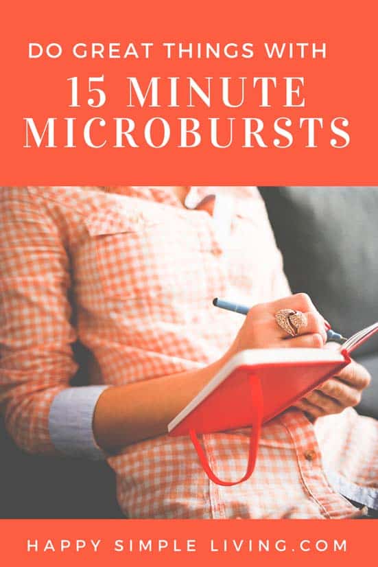 15 minute microbursts help me overcome procrastination. 15 minute intervals are bearable, no matter how tough the project. 15 minutes of work can help you start something you’ve always wanted to do.