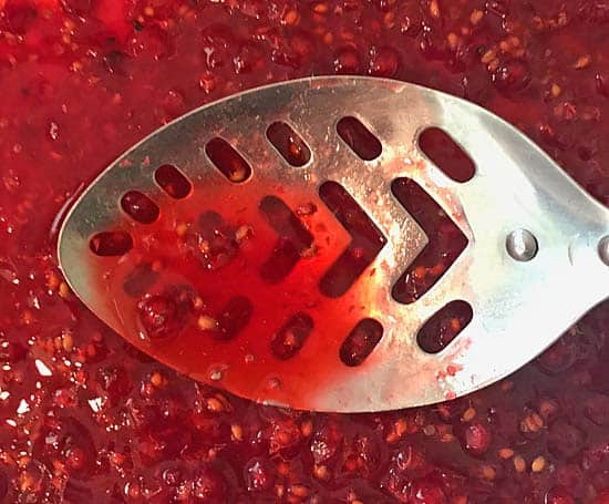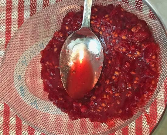 While the tea is cooling, extract the juice from the fresh currants. To do this, I simply add 2 tablespoons cold filtered water to 1 cup of fresh, washed currants in a shallow dish and smash with the back of a slotted spoon. You can also use a juicer if you have one.