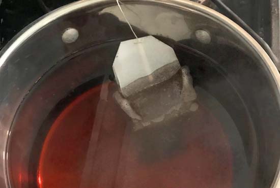 The first step is to make a fresh pot of hot tea. Bring 8 cups of water to a boil in a stainless steel pot over high heat. Remove from the heat and add 2 regular tea bags or 1 family size bag.