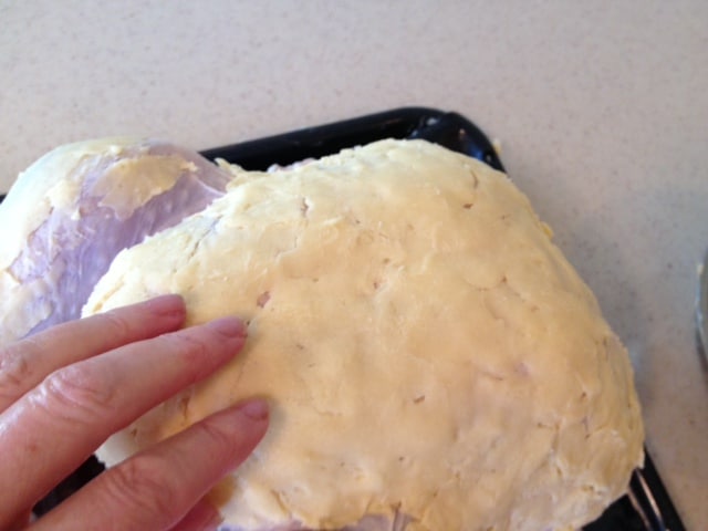 This works best if the turkey is at room temperature and very dry. If the turkey’s a little cold and the mixture doesn’t go on evenly, don’t worry! Just pat it on the best you can.