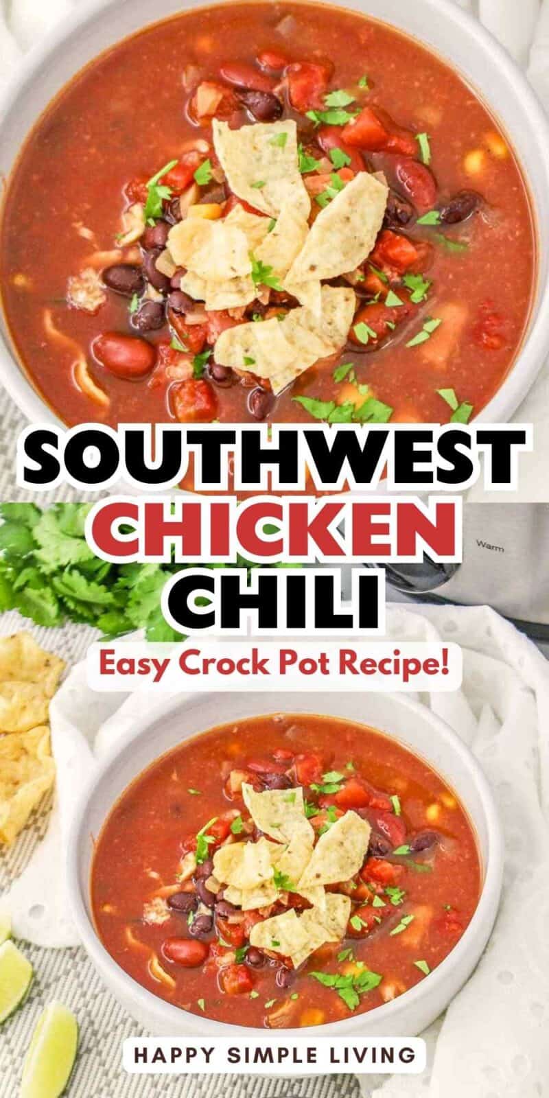 Southwest Chicken Chili is one of my family’s favorite easy crock pot recipes. It features tender chicken slow cooked in a spicy broth with corn, tomatoes, chipotle chiles and two kinds of beans.
