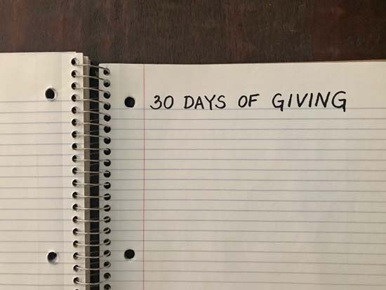 Take a piece of notebook paper, and write “30 Days of Giving” at the top. On the back side, write “30 Days of Receiving.” (If you are a praying person, you may wish to send up a little prayer that God will show you opportunities to share.)