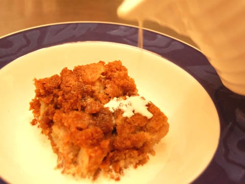 Alternatively, before you bake the cake you can add this streusel-y topping which originally appeared in a coffee cake recipe in Maxine’s book. Simply combine (in another small bowl! Aren’t you glad you bought the 4-piece set?) 1/2 cup brown sugar, 1 ½ tablespoons flour, 1 ½ teaspoons ground cinnamon and 2 tablespoons cold butter (the original recipe calls for unsalted butter, but you most definitely want salted butter).