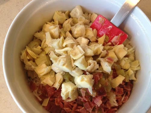 - In a 1 1/2-quart ovenproof dish, combine the mayonnaise, three-fourths of the bacon bits, the artichoke hearts, the Monterey Jack cheese, 3/4 cup of the Parmesan cheese (reserve the remaining 1/4 cup for sprinkling on top) and chiles.