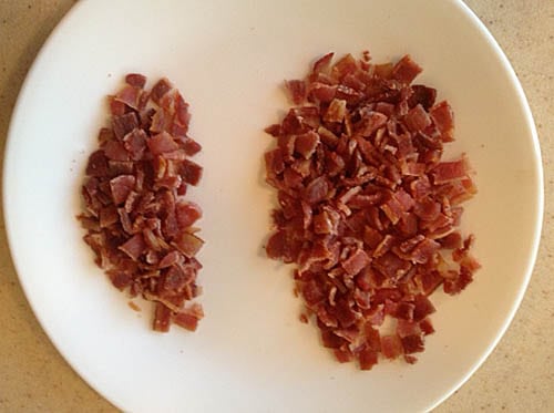 - Preheat oven to 350 degrees F. Chop or crumble the bacon finely, reserving about a fourth of the bacon bits to sprinkle on top.