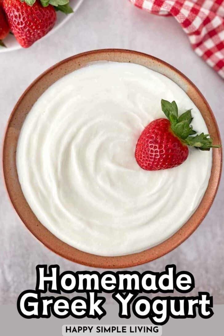 A ceramic bowl filled with Greek yogurt and garnished with a fresh strawberry.