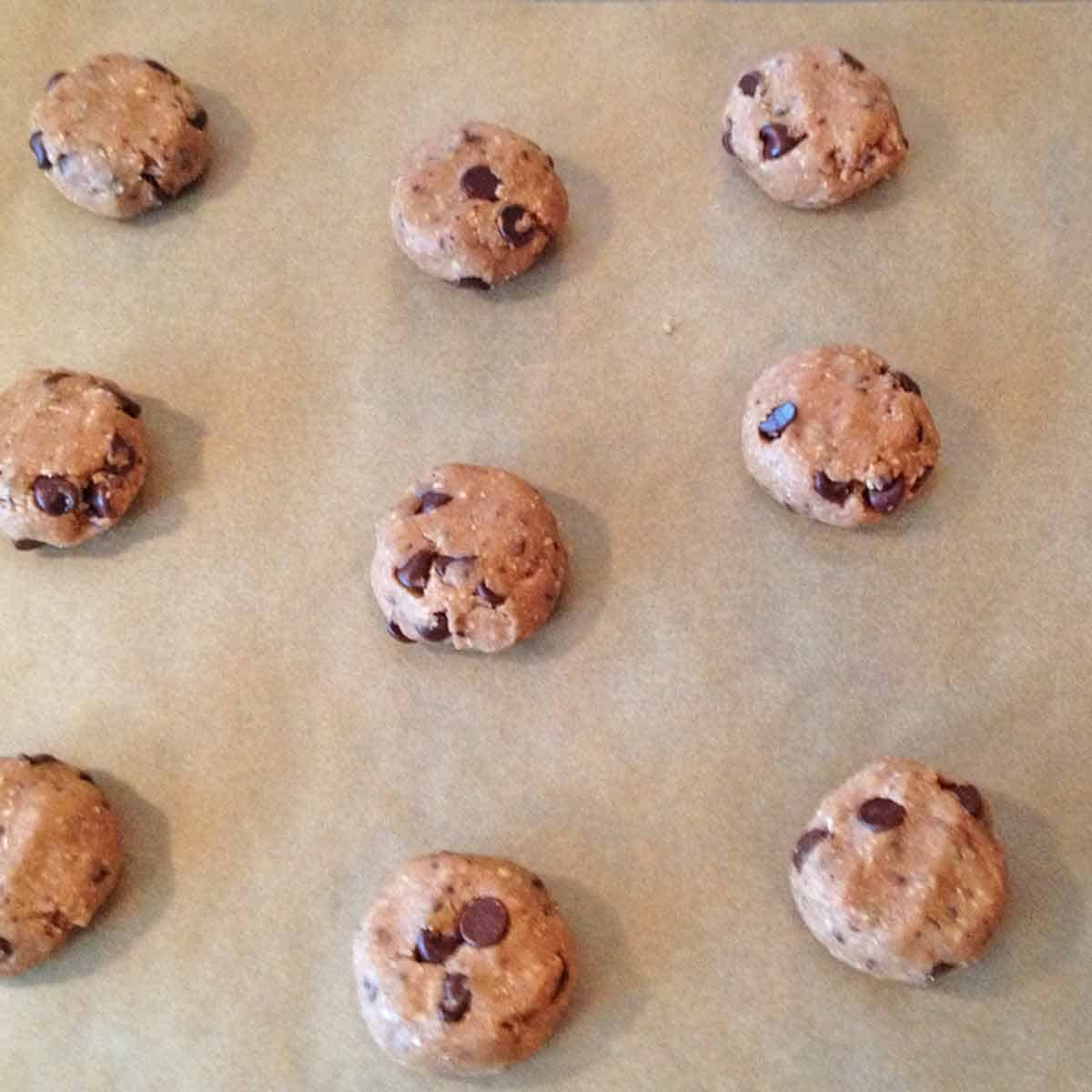 - Roll the dough in golf-ball sized balls and arrange on the parchment-lined cookie pan. Flatten the dough balls gently with your hand.