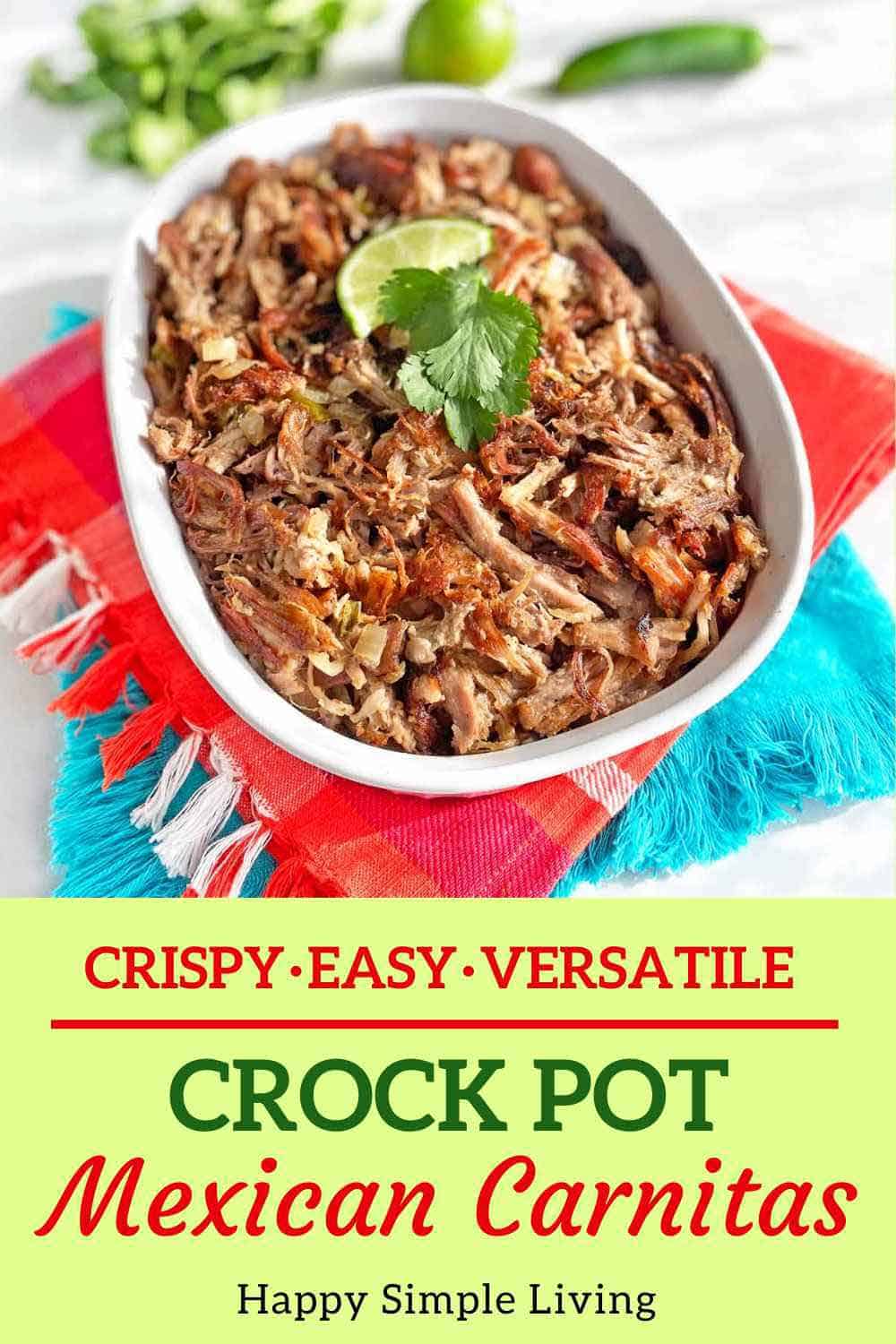 This is my favorite crispy pork Mexican Carnitas recipe made in the crock pot. In this version, the pork is slow cooked all day with jalapenos, onions and seasonings.