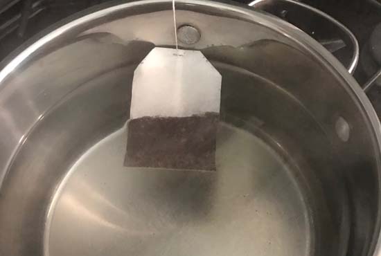 The first step is to make a fresh pot of hot tea. Bring 8 cups of water to a boil in a stainless steel pot over high heat. Remove from the heat and add 2 regular tea bags or 1 family size bag.