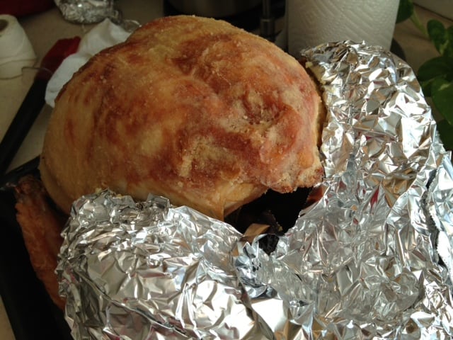 After about 1 1/2 hours, the turkey will have developed a nice crust and you can start brushing it with some of the pan drippings. You will probably need to cover the drumsticks with foil about halfway through cooking so they don’t get too brown.